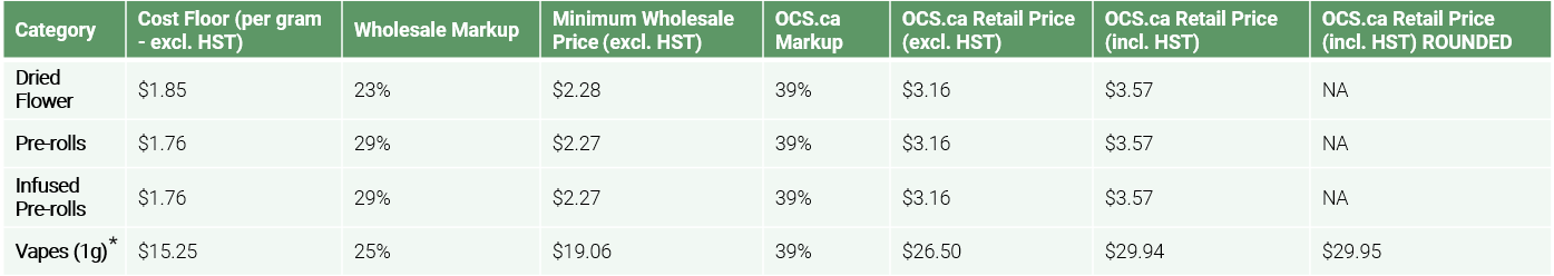 The OCS establishes Wholesale Prices and OCS.ca prices, including wholesale fixed markup rates by product subcategory