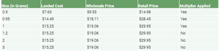 - Formats above 1 g will be priced at a flat MSRP of $29.95, without applying the multiplier.
