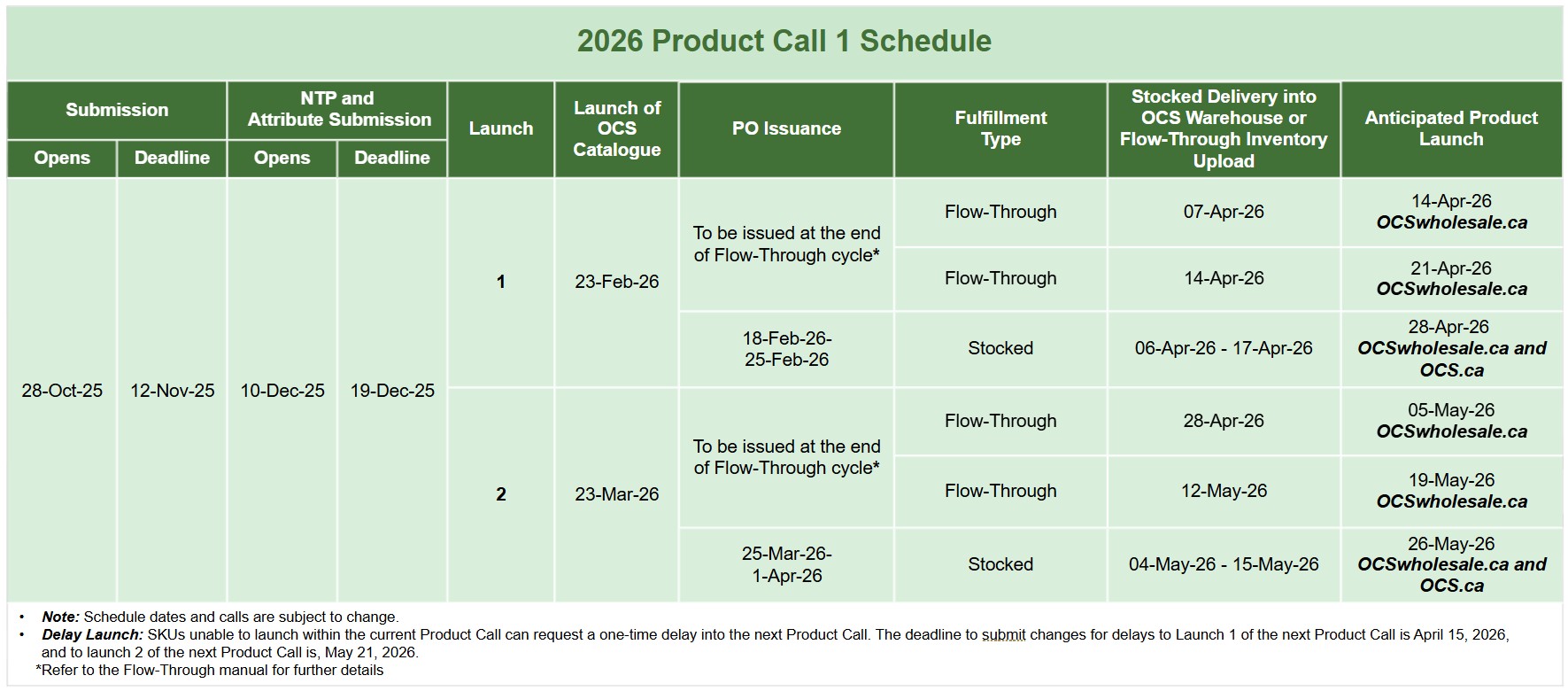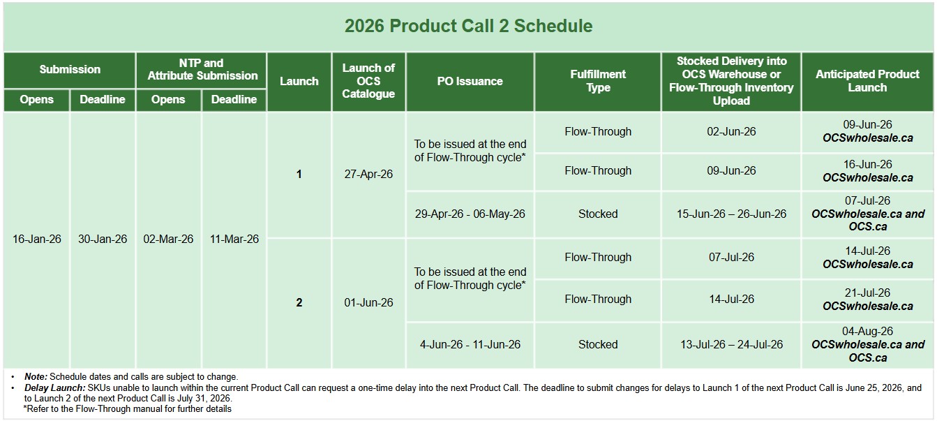 The OCS posts five Product Calls each year. Please note that the OCS warehouse delivery window and rolling launch dates will be updated in the Product Call Schedules below once Purchase Orders (POs) are issued for each call. Please review the Annual Schedule Overview for long‑term planning, along with the individual Product Call schedules for call‑specific details.